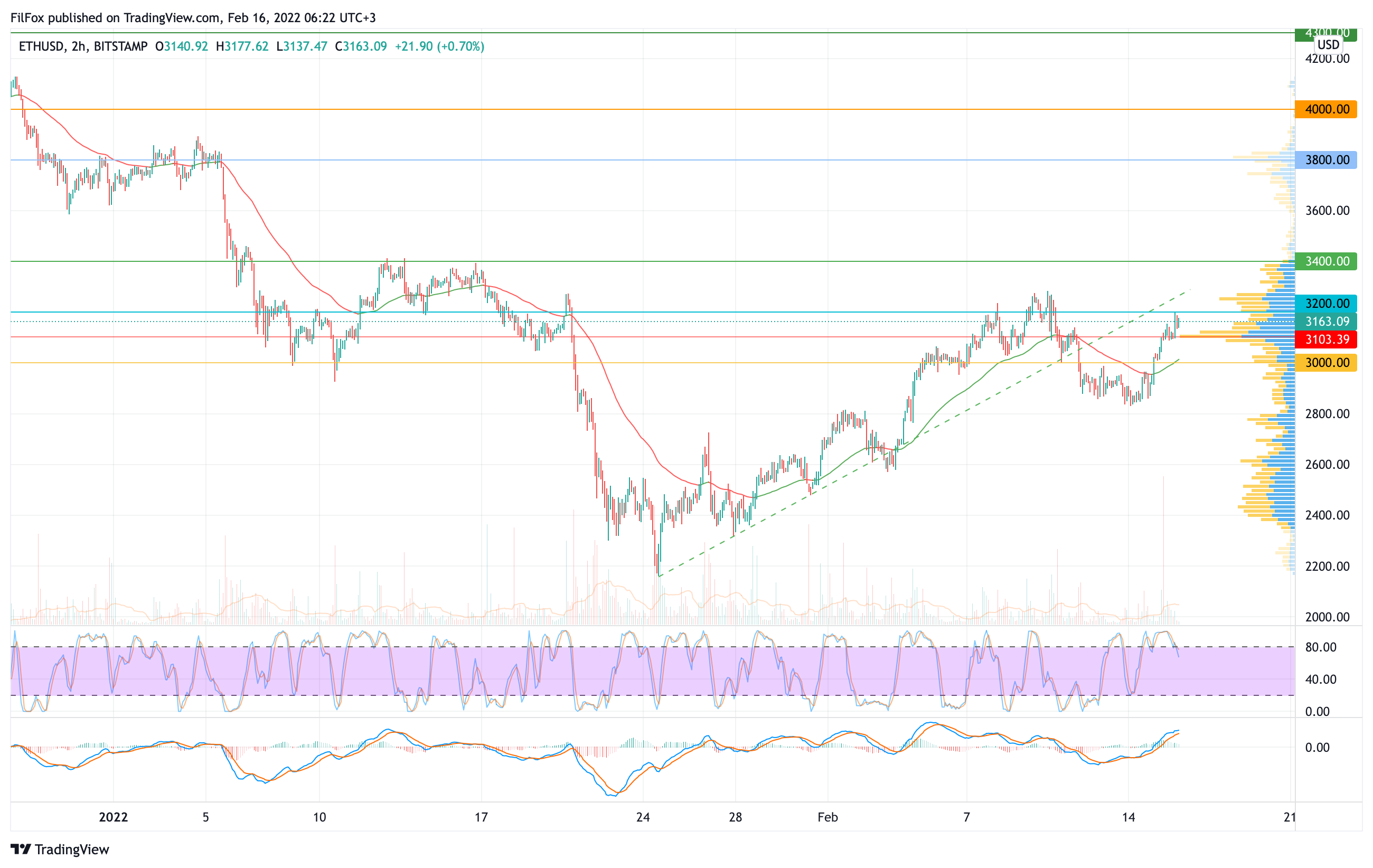 Вчера днём, несмотря на мощное сопротивление медведей, покупателям удалось пробить уровень 3100.00 USD, а ночью цена Ethereum установила локальный максимум в районе отметки 3199.00 USD.