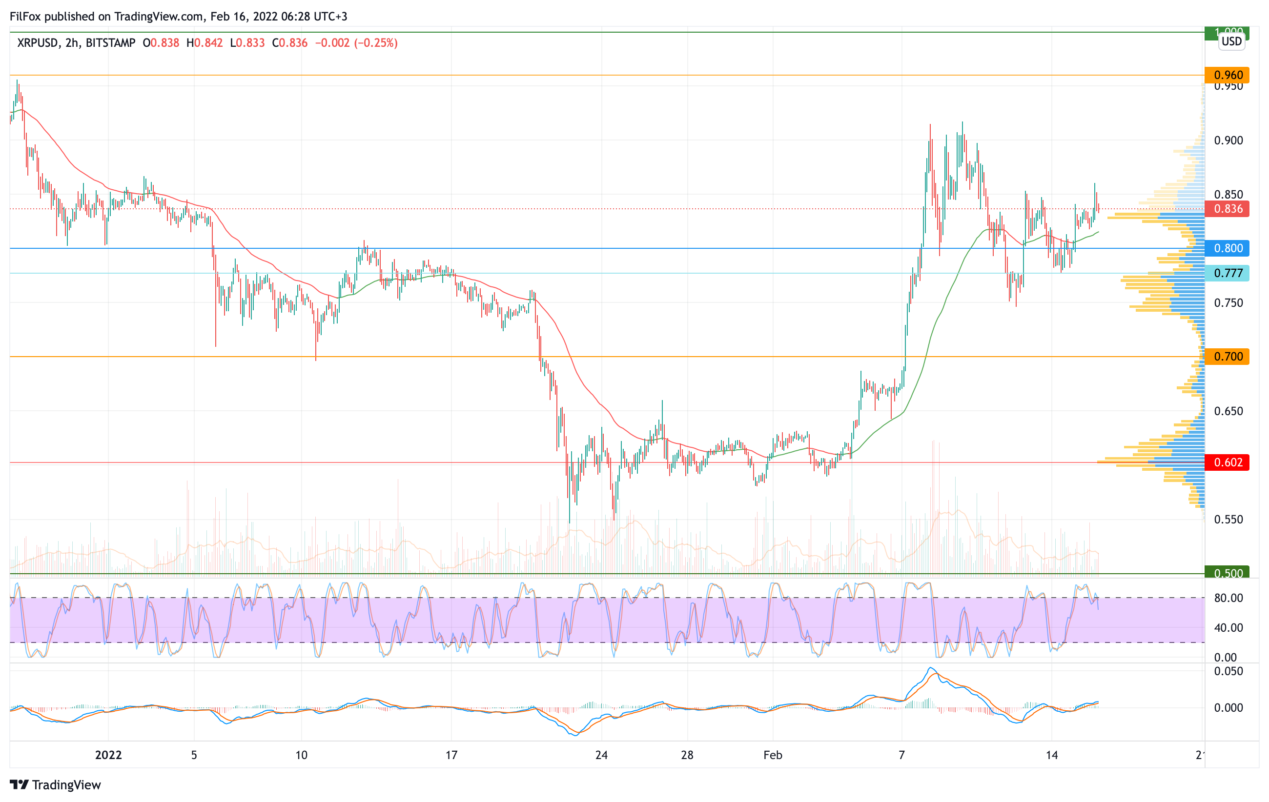 Вчера цена XRP двигалась, преимущественно, в боковом направлении. Сегодня ночью покупателям удалось сформировать слабый бычий импульс и обозначить локальный максимум в точке 0.860 USD.