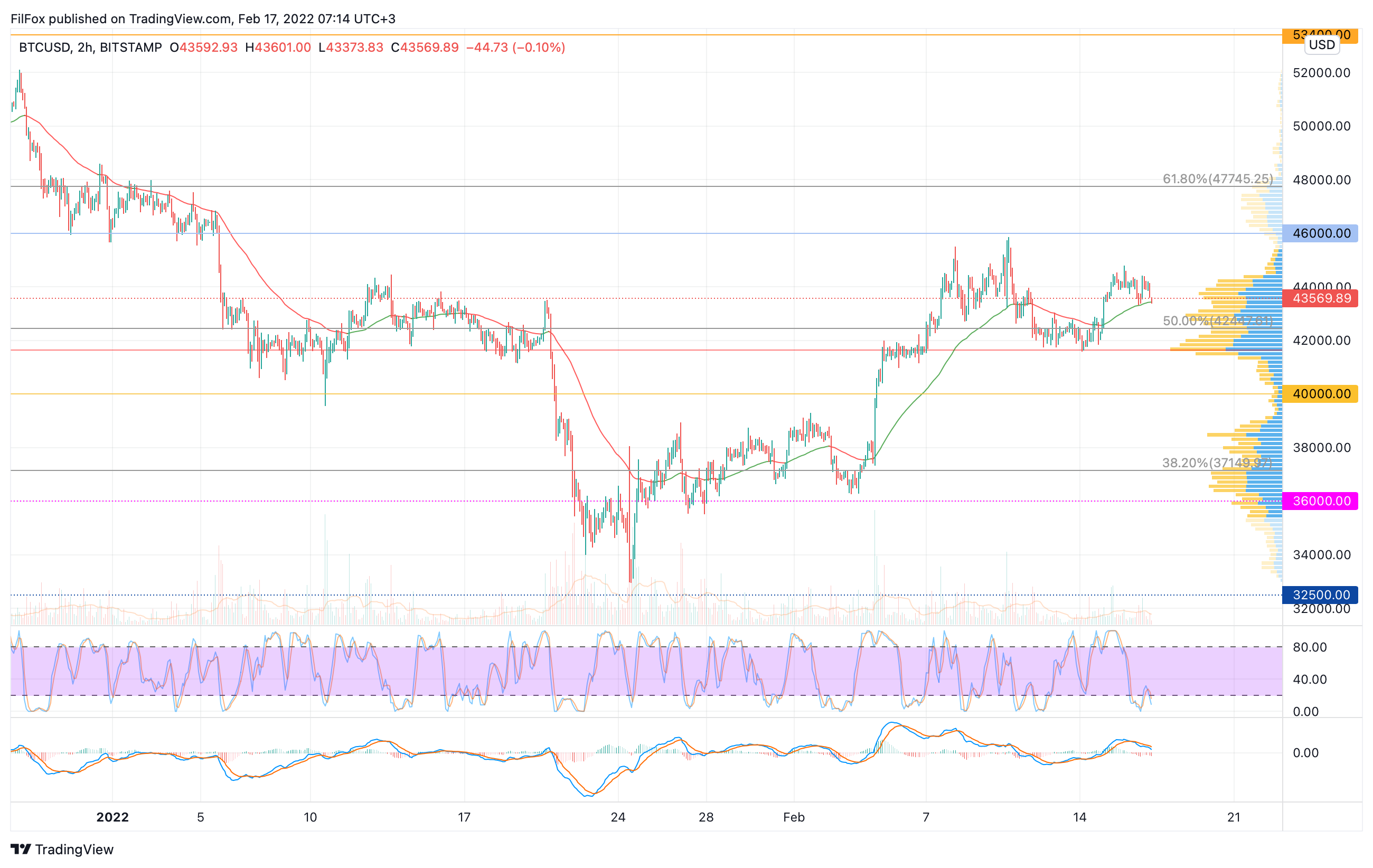 Вчера в первой половине дня цена биткоина пыталась удержаться в узкой консолидации на уровне 44000.00 USD. После обеда продавцы сформировали слабый медвежий импульс и оттеснили пару в область средних цен.