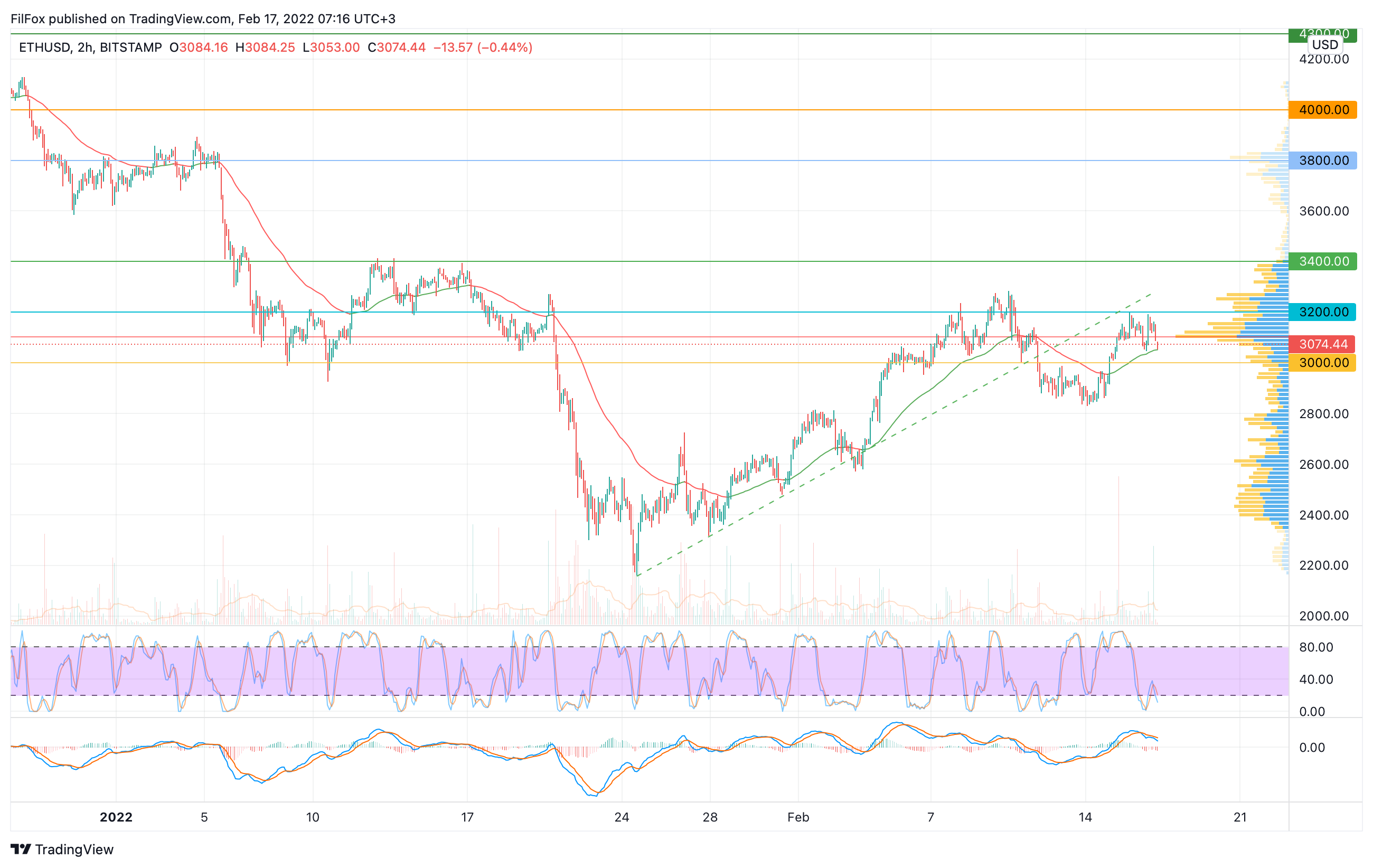 Вчера в первой половине дня цена ETH откатилась в область двухчасовой EMA55, а поздно вечером покупатели предприняли очередную попытку пробиться выше сопротивления 3200.00 USD.