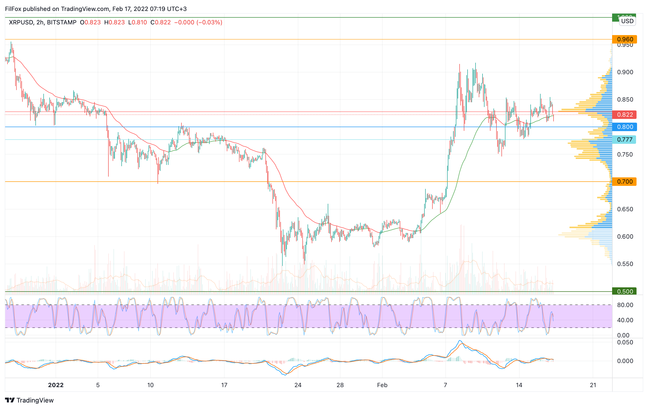 Вчера медведи доминировали на рынке и пытались выбить цену XRP ниже двухчасовой EMA55. Во второй половине дня продавцы прокололи уровень средних цен, но пара смогла вернуться к линии POC (0.822 USD).
