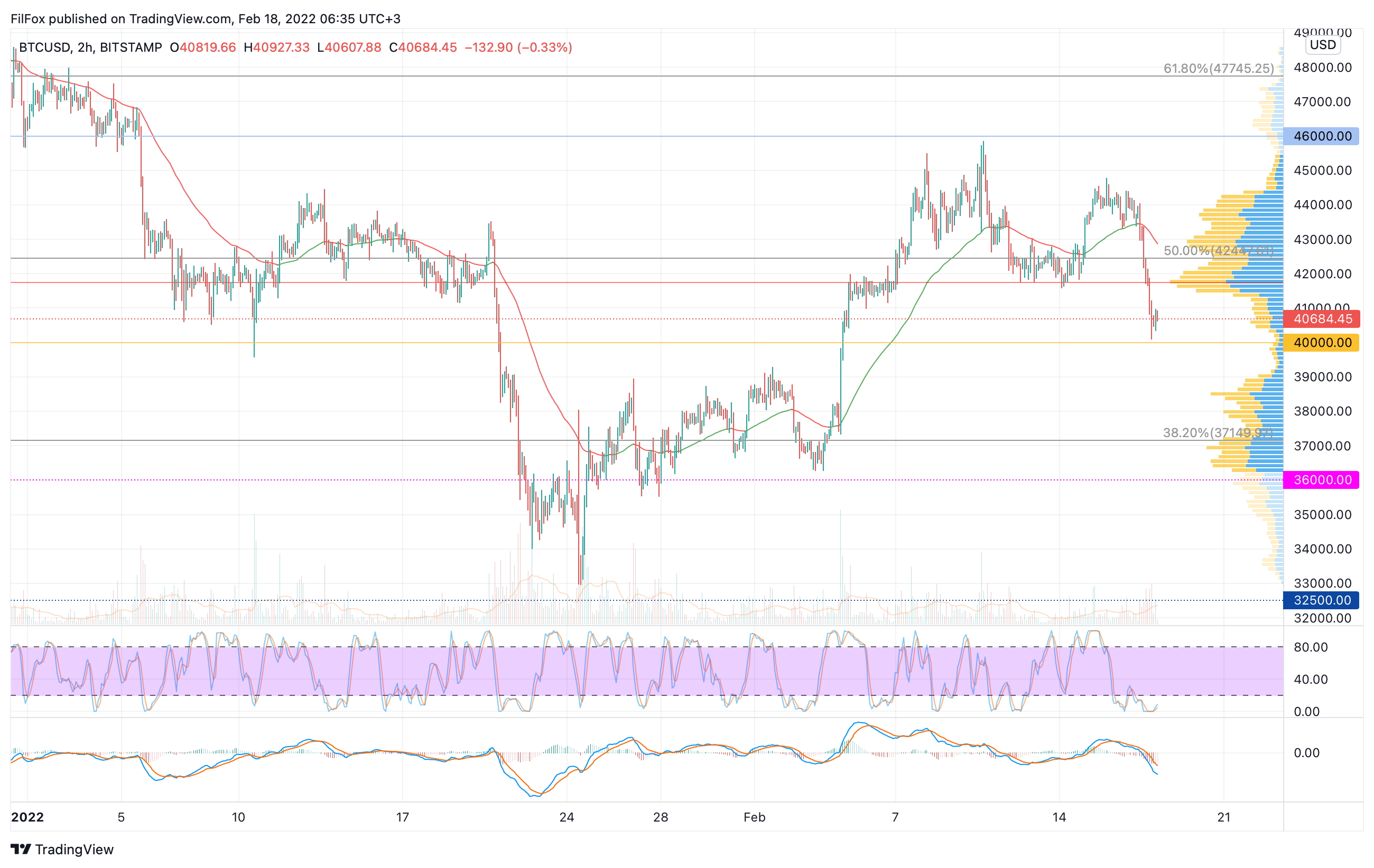 Вчера утром двухчасовая EMA55 не смогла удержать натиск медведей и цена биткоина просела ниже среднего уровня. Во второй половине дня давление продавцов усилилось и пара пробила 50% фибо (42447.61 USD). До завершения дня стремительное снижение остановилось в районе психологической поддержки 40000.00 USD.