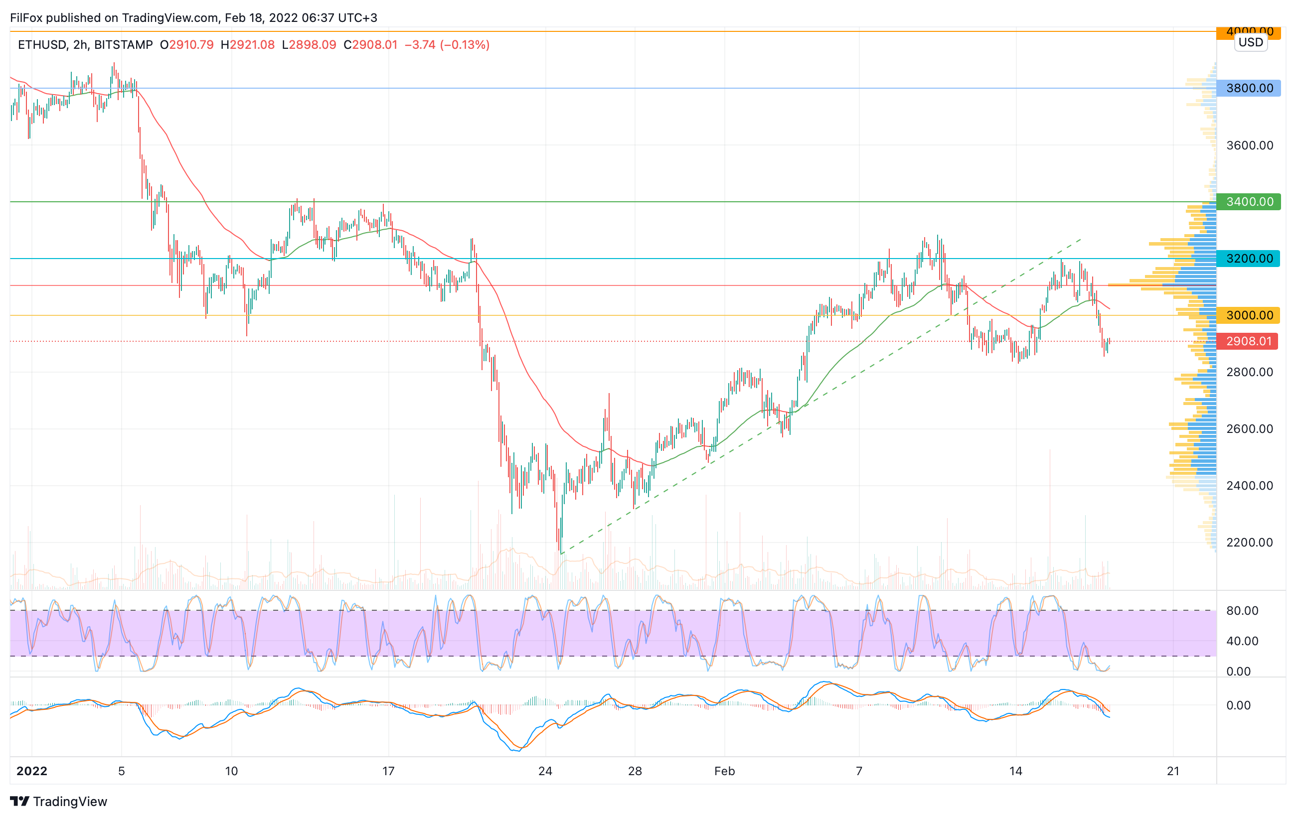 Вчера утром слабый бычий импульс не справился с сопротивлением на уровне 3100.00 USD, и цена Ethereum откатилась ниже уровня двухчасовой EMA55.
