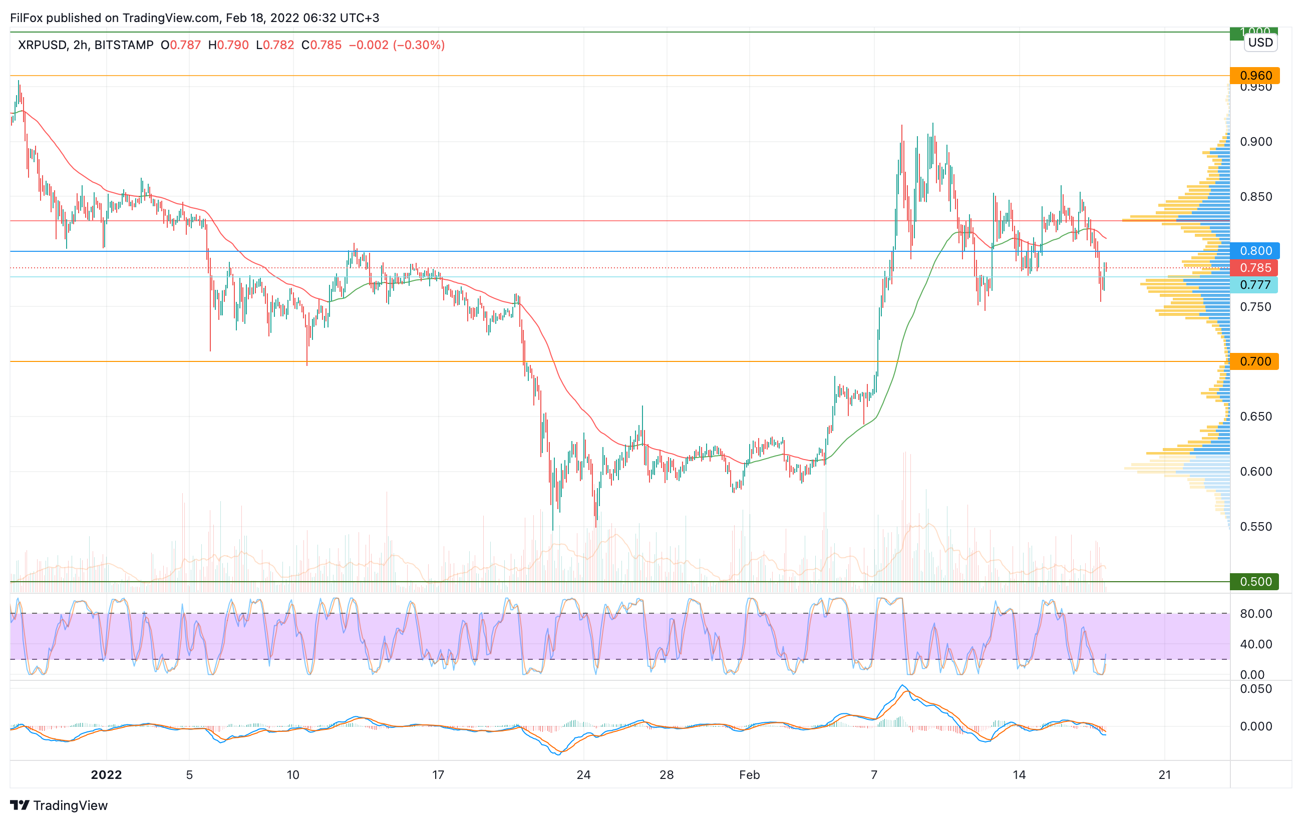 Вчера утром в области средних цен покупателям не удалось перехватить инициативу у продавцов. Снижение цены криптовалютного флагмана повлекло падение пары XRP/USD ниже сильной поддержки 0.800 USD. Ночью цена Ripple проколола уровень 0.777 USD и падение приостановилось.