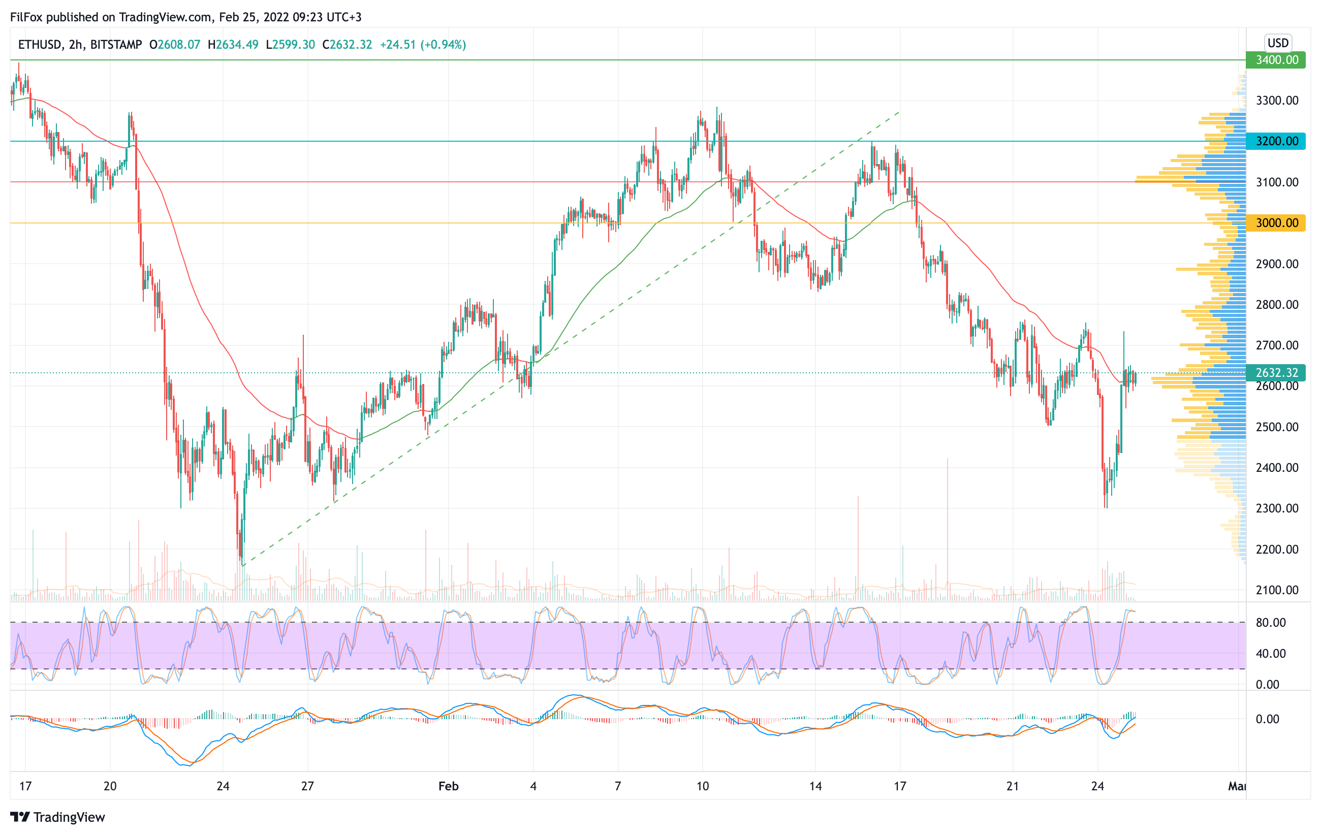 Вчера утром поддержка 2300.00 USD смогла удержать цену Ethereum от дальнейшего снижения. Восстановление сначала проходило на средних объёмах, а ближе к завершению дня бычий импульс пробил двухчасовую EMA55 и ночью пара закрепилась выше уровня средних цен в узкой консолидации.