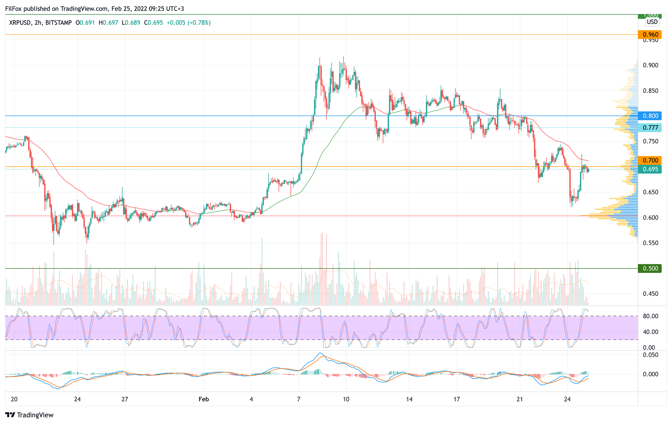 Вчера утром цена XRP отскочила в область 0.650 USD, но на этом восстановление не завершилось. Вечером покупатели сформировали бычий импульс, который пробил оранжевое сопротивление 0.700 USD и протестировал двухчасовую EMA55.