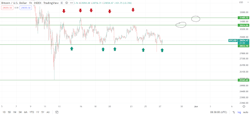 На 27.05.2022 Bitcoin находится в диапазоне $30 600 - $28 600, что свидетельствует о сжатии волатильности и скором пробое уровней поддержки или сопротивления.
