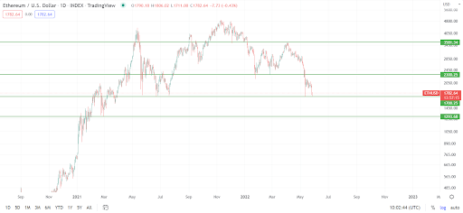 Сценарий 2 (негативный) - пробой уровня $1 700 и движение к уровню $1 300 с длительным флэтовым движением между ними.