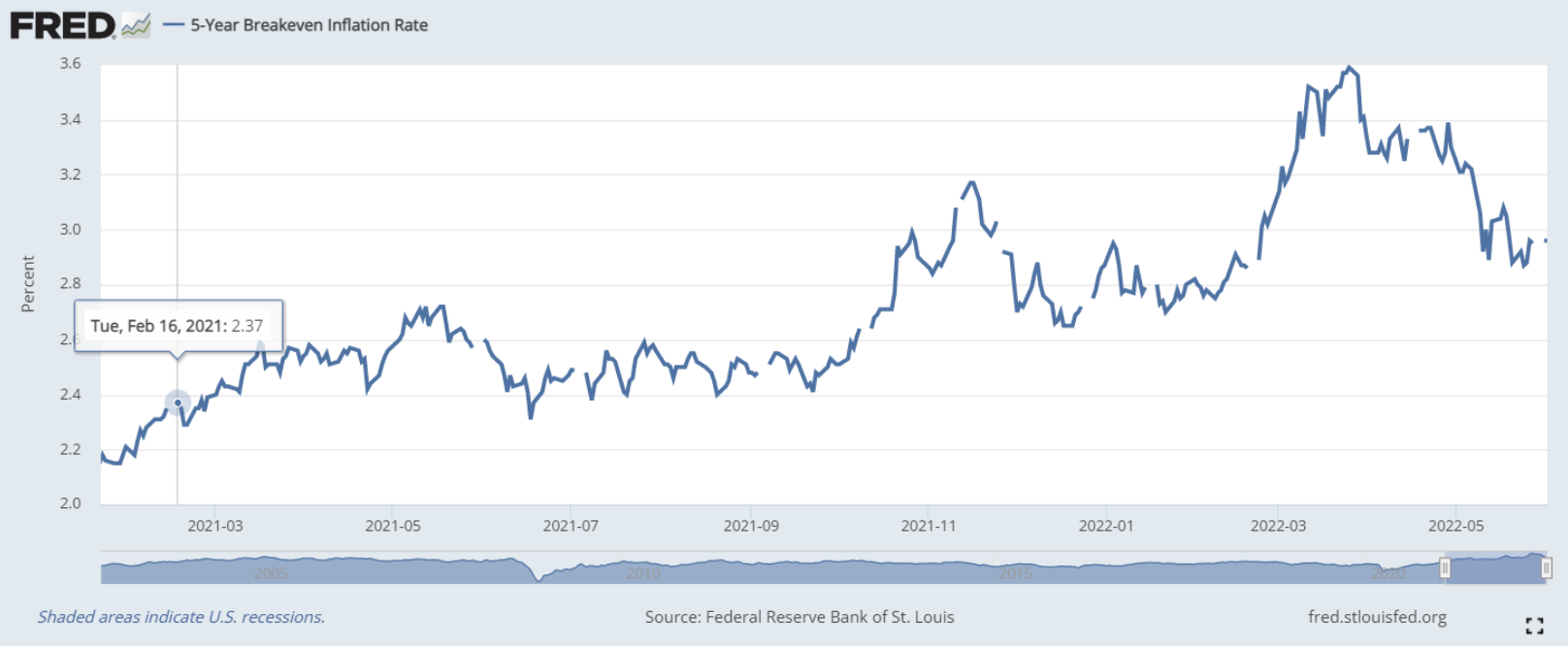 На фоне замедления деловой активности, по словам представителя ФРС от 01.06.2022, продолжается рост, и идет неплохая коррекционная волна на фондовом рынке США. Если мы посмотрим ниже на ожидаемую инфляцию, то можем заметить, что после пиковых значений она стабилизировалась и находится на уровне около 3%, что придает немного позитива на летний сезон коррекции.