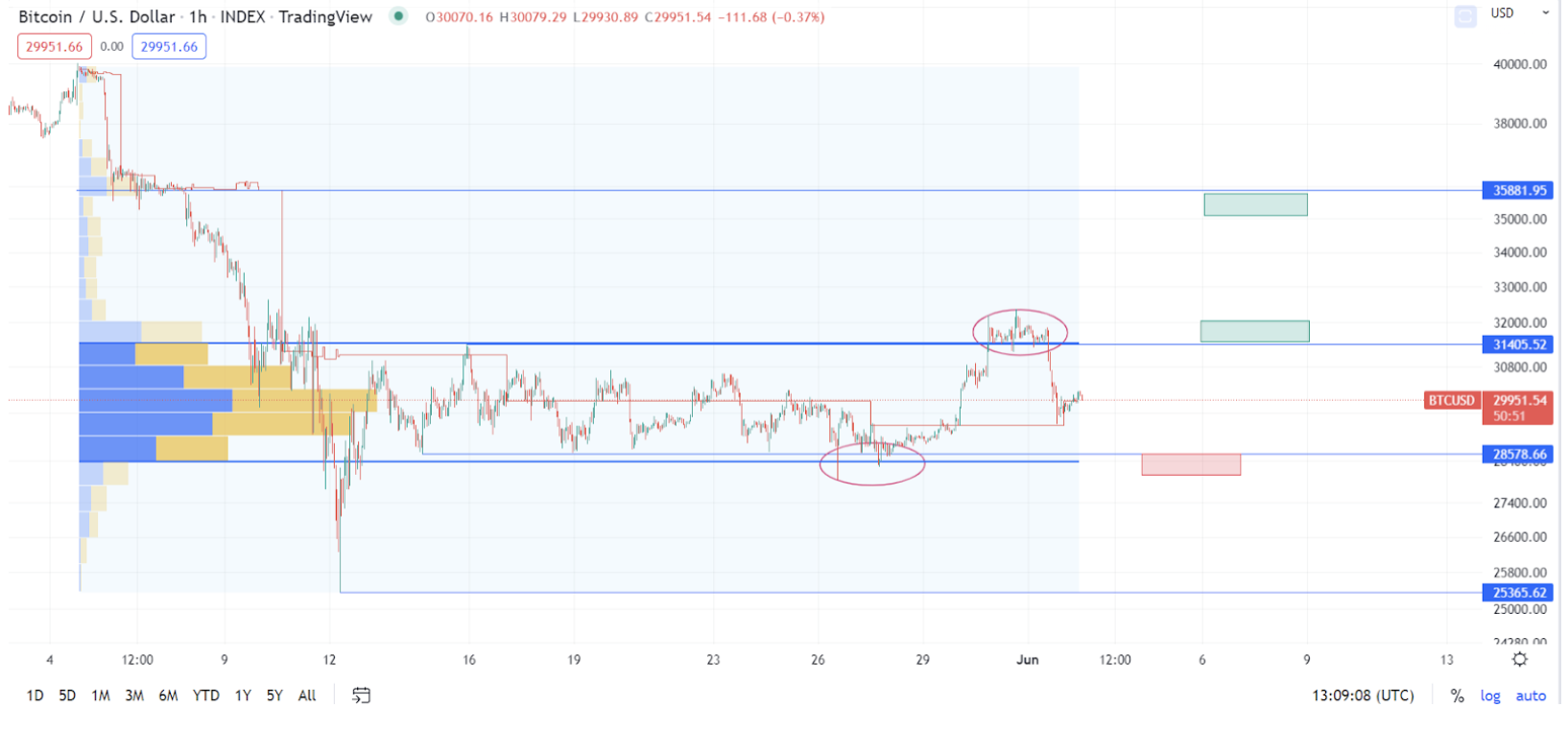 Невзирая на весь фундаментал и высокую корреляцию криптовалютного рынка с фондовым, можем заметить, что после ретеста ключевой зоны (VAH) над уровнем $31 400, цена BTC все же откатилась и приблизилась к POC $29 300. Во многом такая тенденция обуславливается действиями крупных игроков, которые методично накапливали активы на падении рынка, и чередой лонговых ликвидаций, которые открывали свои сделки на пробое $31 400.