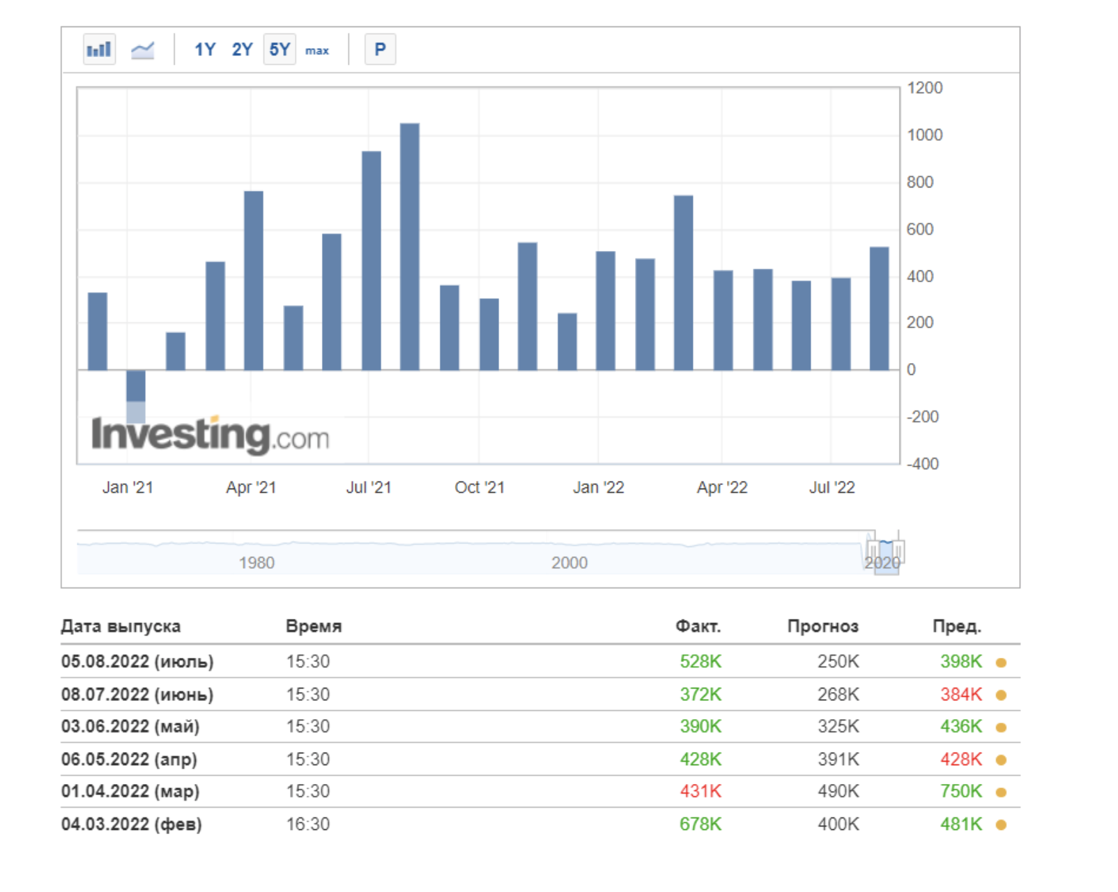 Пятница, 5 августа, стала горячей в плане выхода одного из ключевых составляющих индикаторов рецессии - Nonfarm payrolls. За июль 2022 года показатель изменился - по факту 528 тыс. новых рабочих мест, и это на фоне того, что за второй квартал мы получили снижение ВВП США. Это говорит о переломе тренда и может послужить предметом для разговоров о повышении ставок всего лишь на 25 bps.