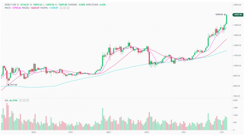 По мере того, как результаты президентской гонки в США начинают проясняться, биткоин преодолел отметку в $15000 - это самая высокая цена с рекордного уровня 2017 года.