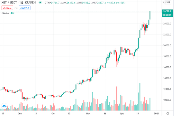 26 декабря на бирже Binance цена BTC установила новый максимум на отметке $26,400. На момент написания статьи один биткоин продается за $26,277.