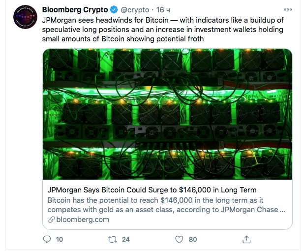 По словам аналитиков JPMorgan Chase, цена крупнейшей в мире криптовалюты может достичь 146,000 долларов, если институциональные инвесторы продолжат добавлять ее в свои портфели.