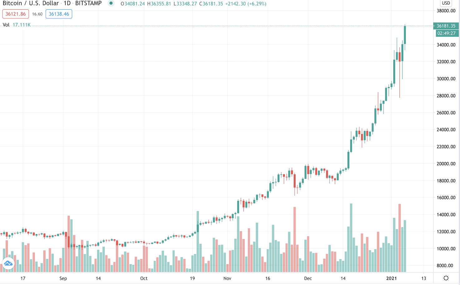 6 января цена биткоина продолжила рост после резкого спада ниже $29,000. На момент написания статьи максимум на бирже Binance был установлен на отметке $36,363.