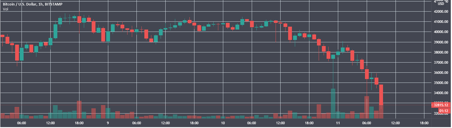 BTC упал более чем на 5000 долларов за сутки, потеряв 20%. Продавцам удалось приблизится даже к ключевой зоне поддержки 32 500 долларов.