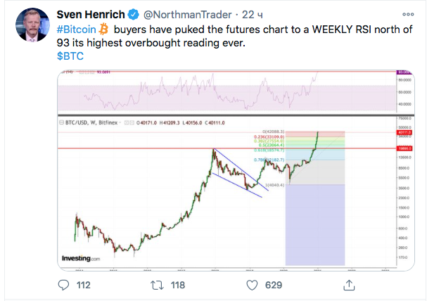 По данным Свена Хенриха, шкала RSI все еще показывает высокую степень перекупленности первой криптовалюты.