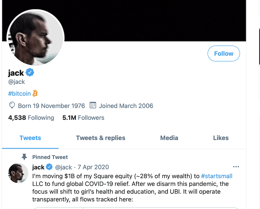 Маск - не единственный миллиардер, который разместил “Bitcoin” в своей шапке твиттера. Генеральный директор Twitter Джек Дорси сделал тоже самое еще в середине 2020 года.