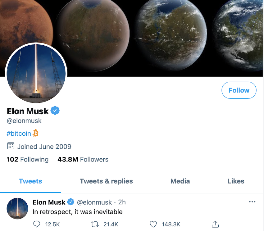 Самый богатый человек планеты обновил свой твиттер - просто добавив слово “биткоин” - и криптовалютный рынок снова взорвался. За несколько часов BTC вырос с $32,000 до $37,000.
