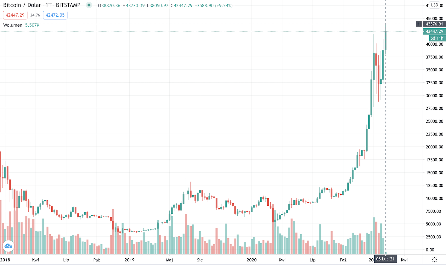 Сегодня, 8 февраля курс биткоина вырос на $4 тысячи буквально за несколько минут. Максимум был установлен около $44,800.