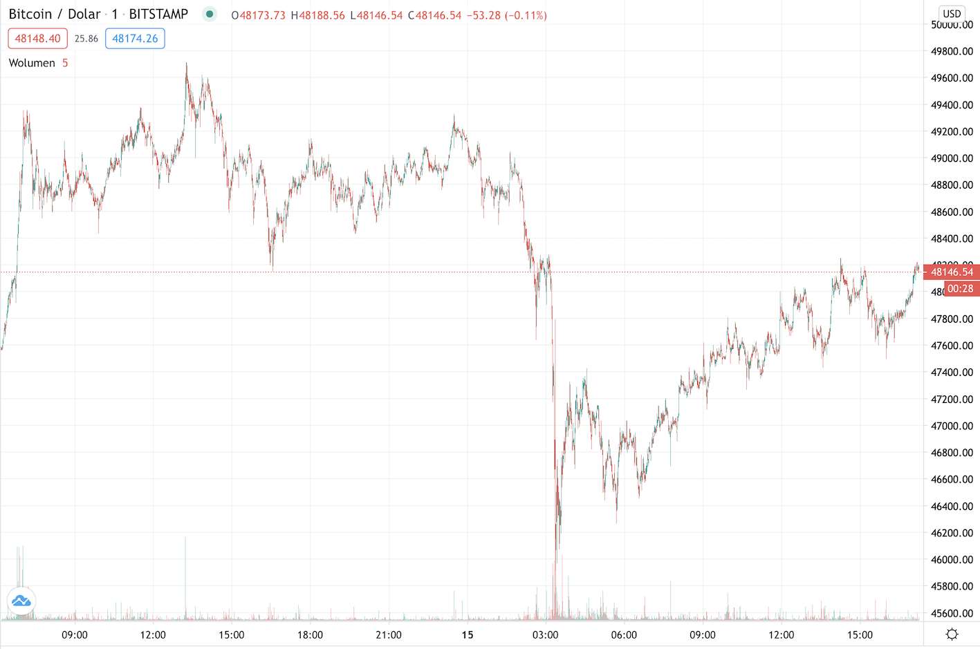 На момент написания статьи цена BTC восстановилась выше $48,000.