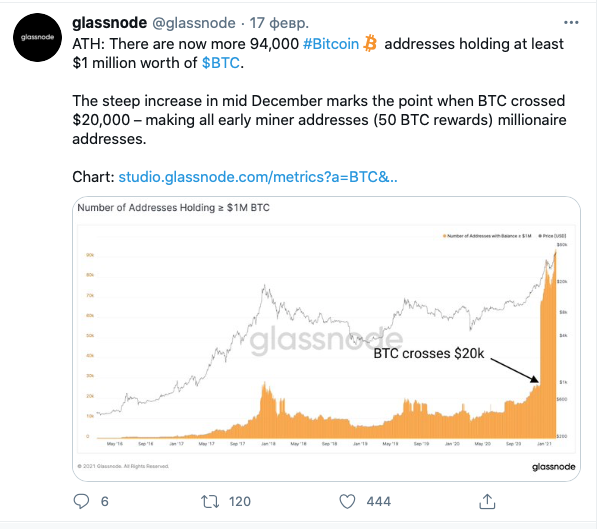 Согласно последним данным, количество адресов-миллионников достигло нового рекордного уровня. На сегодня в мире насчитывается более 94 000 адресов, хранящих $1,000,000 и больше в биткоине. Эксперты считают, что большая часть из них принадлежит институционалам, и состоятельные инвесторы активно накапливают биткойны на фоне бычьего рынка.