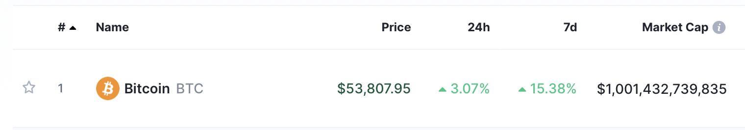 19 февраля цена BTC пробила отметку $53,000 и продолжила расти. На момент написания локальный максимум был установлен около $53,900. Капитализация криптовалюты превысила $1 триллион.