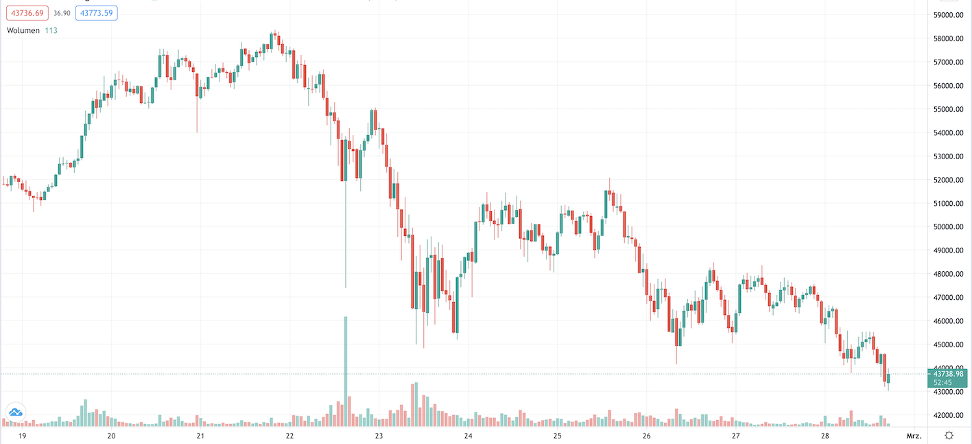 Коррекция криптовалютного рынка продолжается. На момент написания Bitcoin торгуется около $43,700, установив минимум на отметке $43,160. За последние 24 часа цена BTC упала на 7%, а за неделю обвалилась на 25%.
