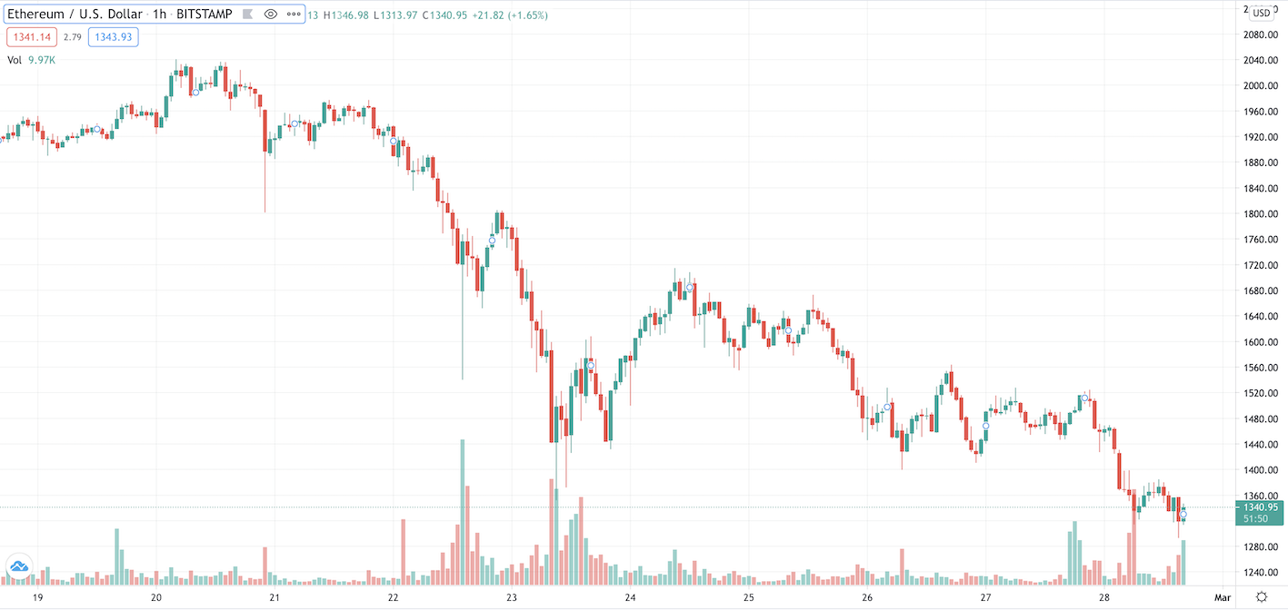 Ethereum также продолжает падать. Вчера ETH торговался около $1500, а сегодня цена упала еще на 10% к отметке $1340. Еще на прошлых выходных ETH стоил больше $2,000. За неделю его цена упала на 33%.
