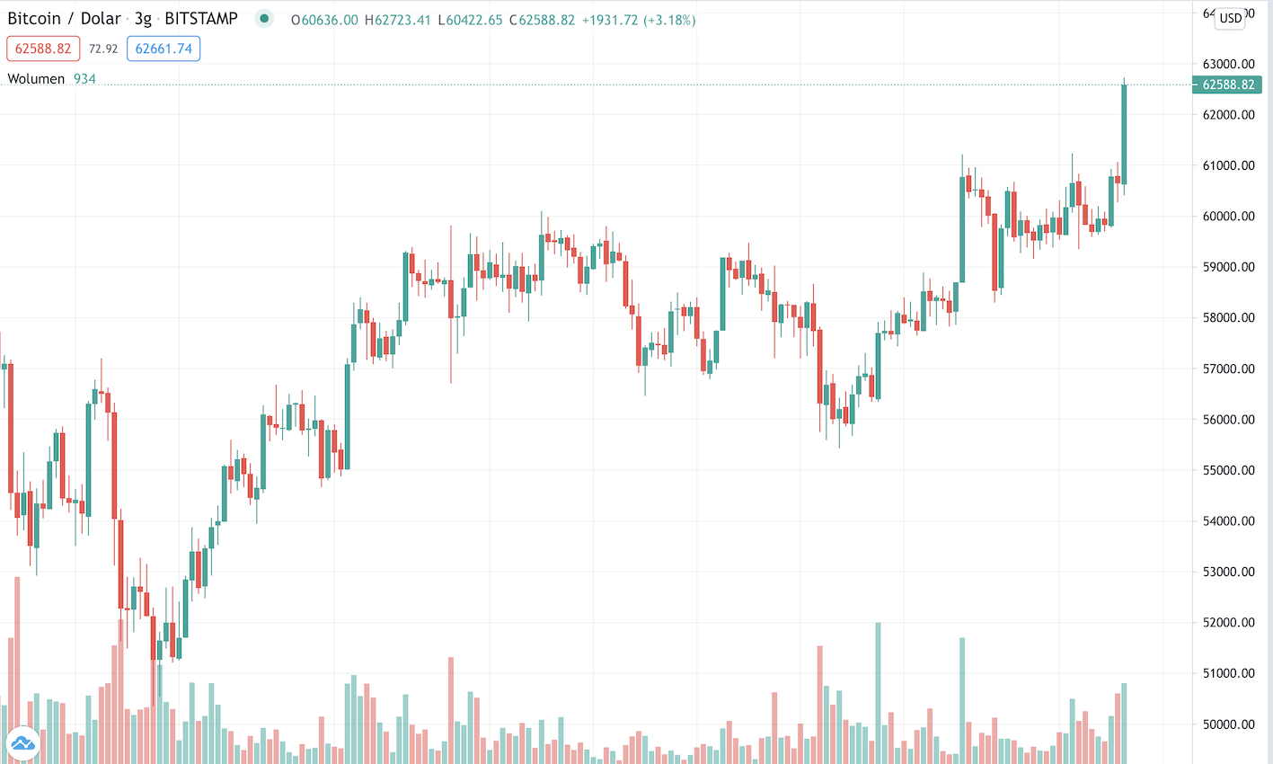 Впервые в истории цена Bitcoin пробила отметку $62,000. Максимум был установлен около $62,900.
