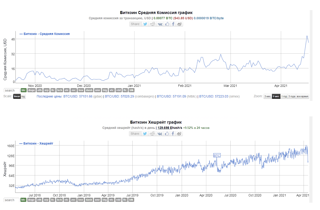Падение хешрейта спровоцировало рост операционных сборов в сети. Средняя цена за перевод поднялась выше $55. К 20 апреля комиссия немного снизилась до $49. Это самые высокие комиссии с декабря 2017.