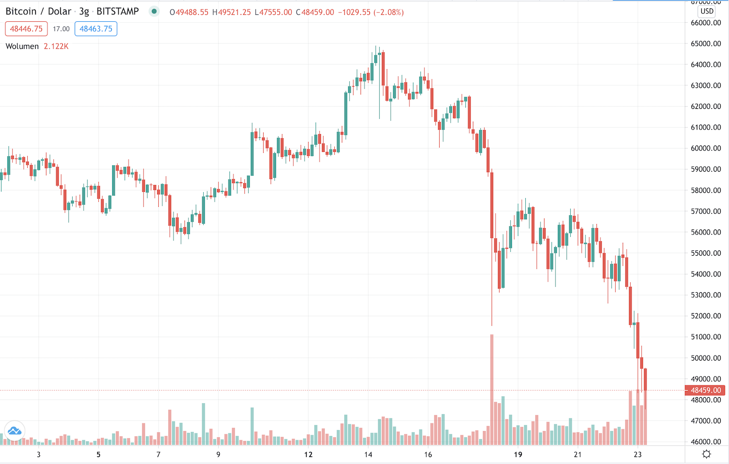 22 апреля цена биткоина впервые с марта упала ниже $50,000.