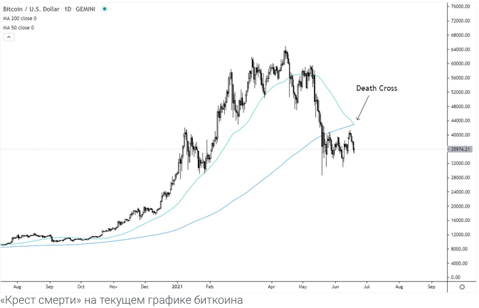 «Крест смерти» - медвежий сигнал, который может указывать на грядущий спад цены BTC. Однако это утверждение не следует принимать за аксиому.