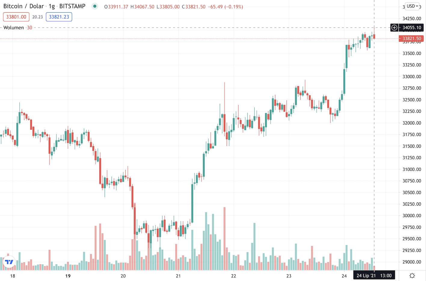 На момент написания BTC торгуется около $33,800. Локальный максимум был установлен на отметке $34,050.