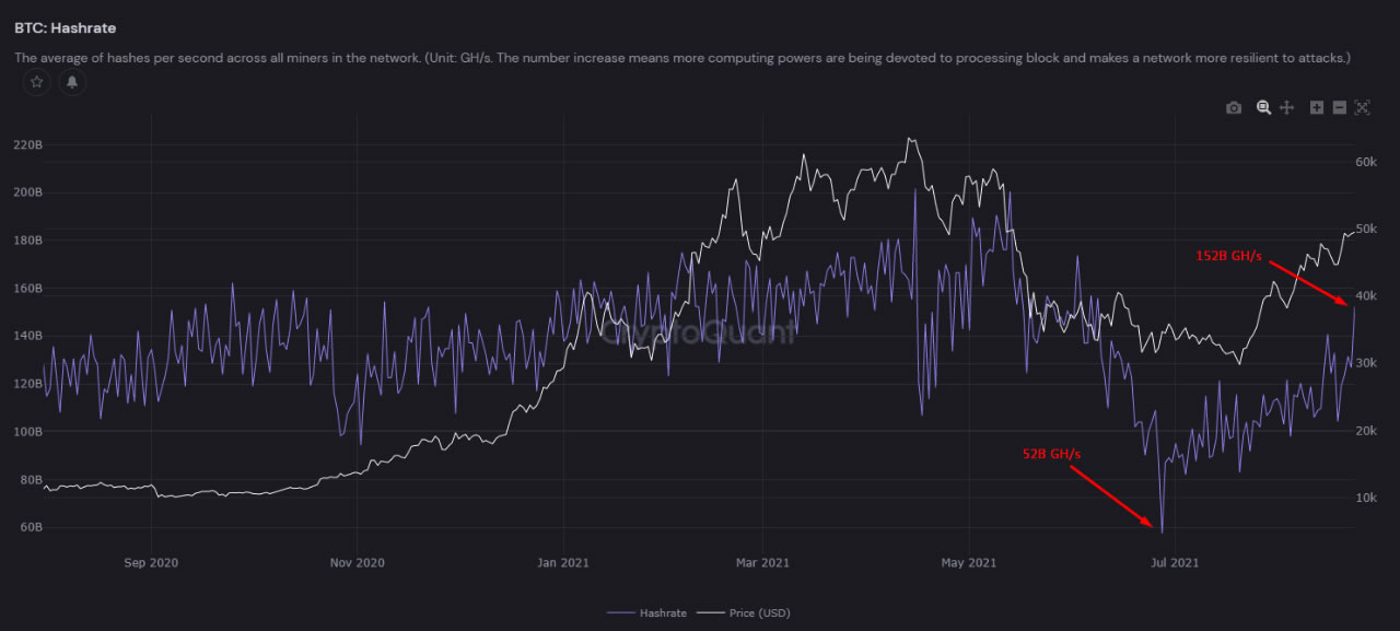 Хешрейт биткоина восстановился до показателей начала июня. Это означает, что майнеры снова подключаются к сети после запретов в Китае.