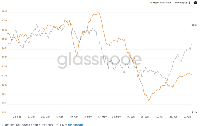 Неотъемлемо связанный со сложностью хешрейт биткоина вырос на 25% с июньского минимального значения. По данным Glassnode, эта цифра составляла 123 эксахэша в секунду.