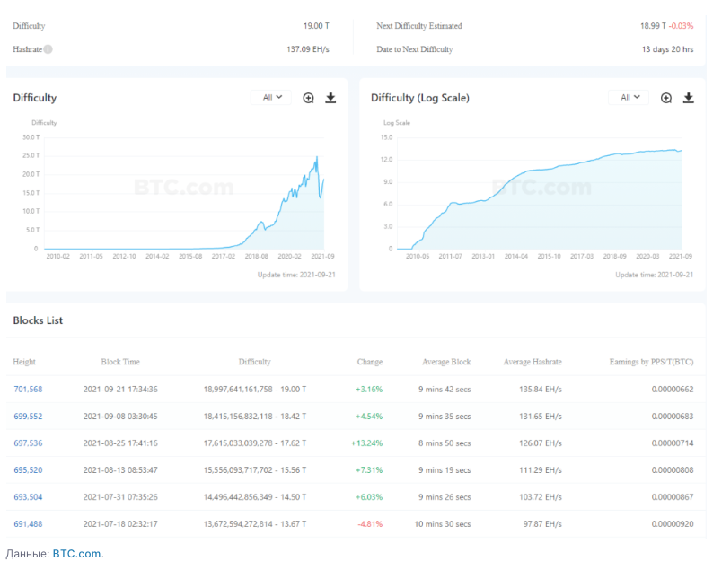 По последним данным BTC.com, показатель сложности добычи BTC увеличился на 3,16%, и составил до 19 T.