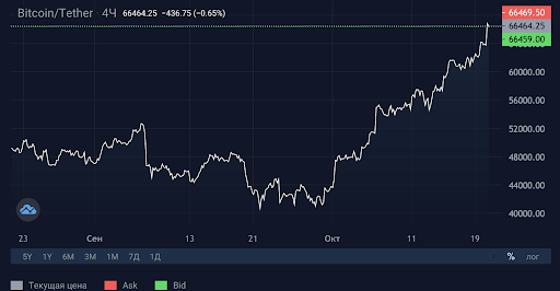 За октябрь биткоин подорожал уже более чем на 40%. Основной причиной для взлета биткоина стало решение Комиссии по ценным бумагам и биржам (SEC) США одобрить биткоин-ETF компании ProShares. Он основан на биткоин-фьючерсах Чикагской товарной биржи (CME Group) и начал торговаться 19 октября на NYSE. Это очень долгожданное решение, потому что долгое время SEC никак не хотела давать своего одобрения. Ее согласия с 2013 года добивались и другие компании, в том числе Fidelity Investment, VanEck, One River и ряд других.
