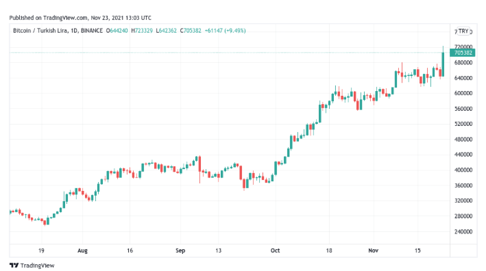 Данные TradingView показывают рекордный рост ВТС по отношению к турецкой лире на фоне гиперинфляции в стране.
