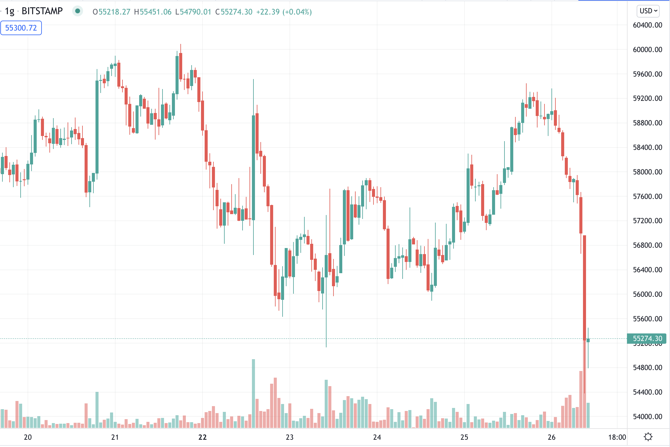 В эту пятницу цена флагманской криптовалюта упала ниже отметки $55,000.