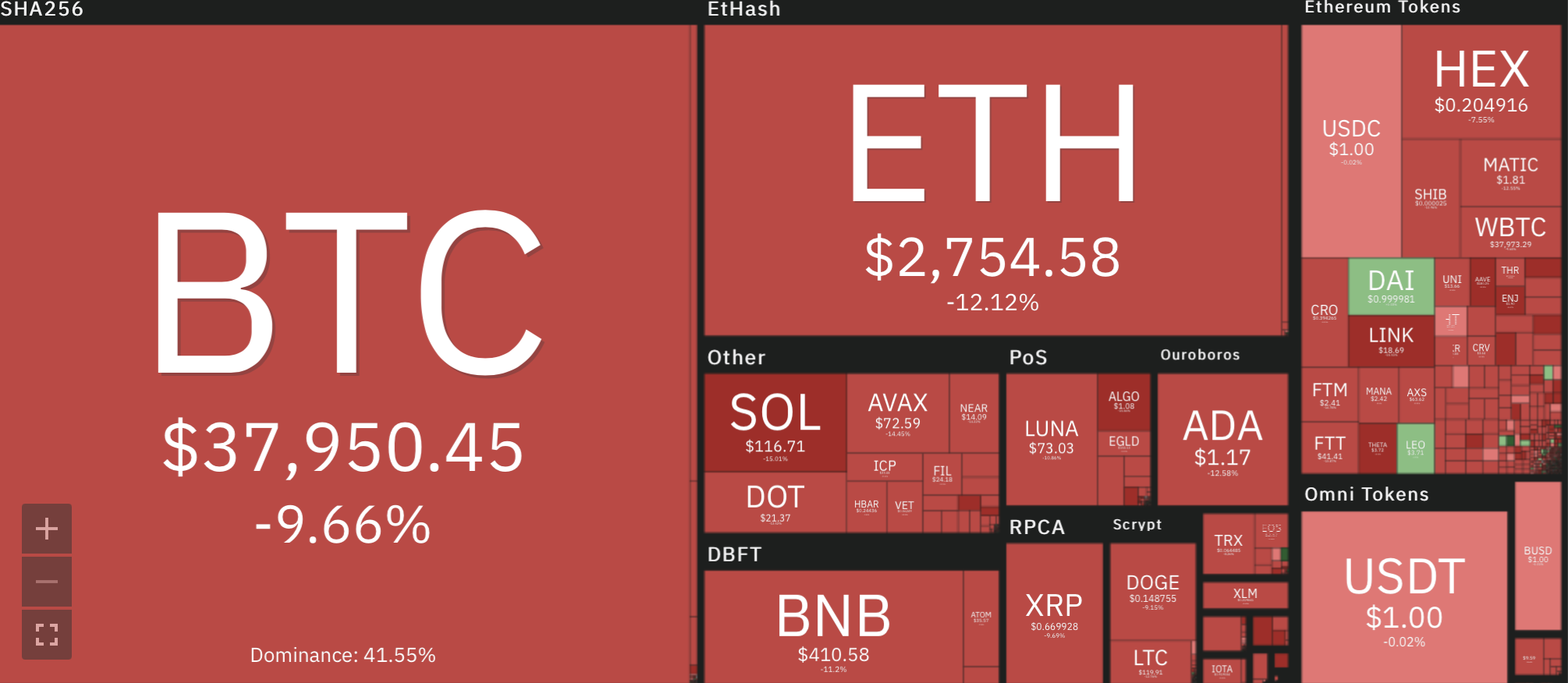 Биткоин упал ниже $38,000 сегодня утром. За последние сутки с рынка криптовалют испарилось более $200 миллиардов долларов - около 8% капитализации.