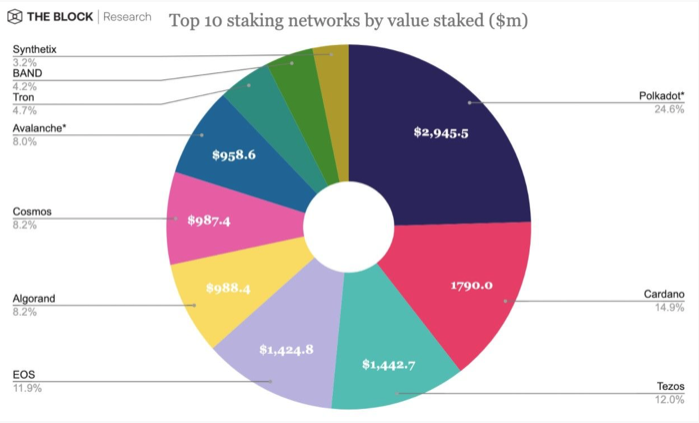В общей сложности на 10 топовых блокчейнах в целях стейкинга заблокировано около $12 млрд. По данным The Block, список лидеров на рынке стейкинга возглавляет сеть Polkadot со своим токеном DOT. Его доля рынка составляет 24,6%, - $2 945 млн.