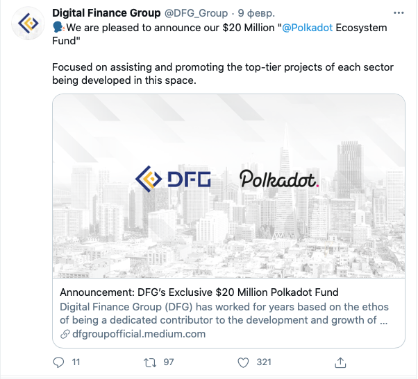 Финансирование экосистемы Polkadot поддержал венчурный фонд Digital Finance Group (DFG).