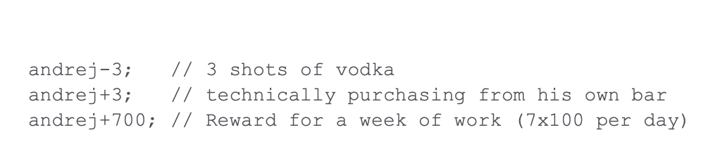 Наш герой готов принимать токены в своем баре. К сожалению, никто к нему не заходит, поэтому он заказывает три рюмки водки для себя и записывает эту сделку в бумажную базу данных: