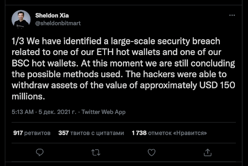 4 декабря руководство BitMart написало о том, что биржу «взломали». Целью атаки, в результате которой клиенты торговой площадки потеряли 150 миллионов долларов в криптоваюте, стали горячие кошельки Ethereum и Binance Smart Chain.