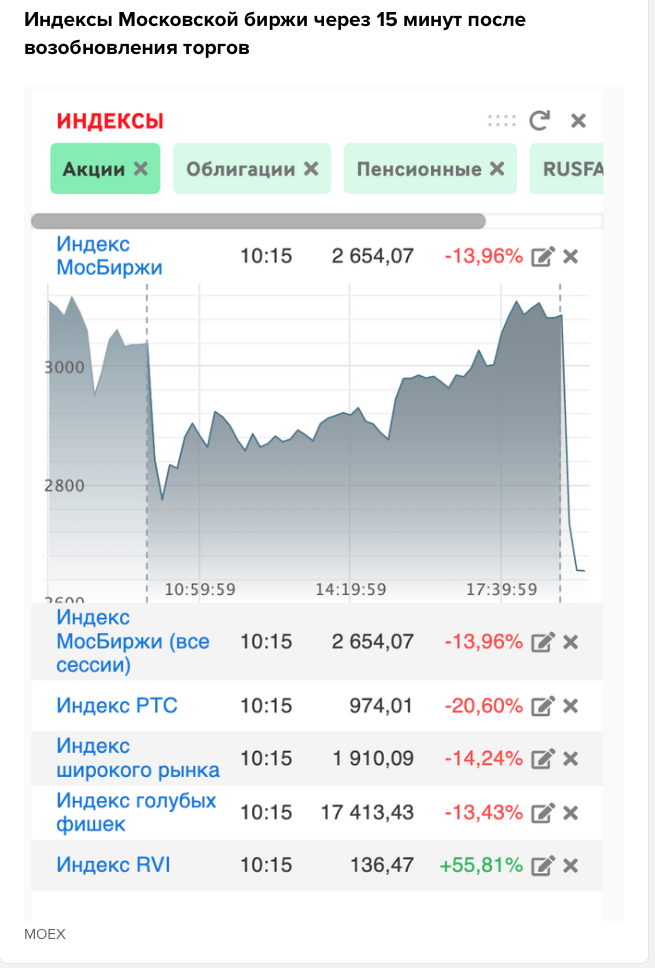 Рынок российских акций падает. Мосбиржа открылась на падении индекса на 11,37% и составил 2734,10 пункта.