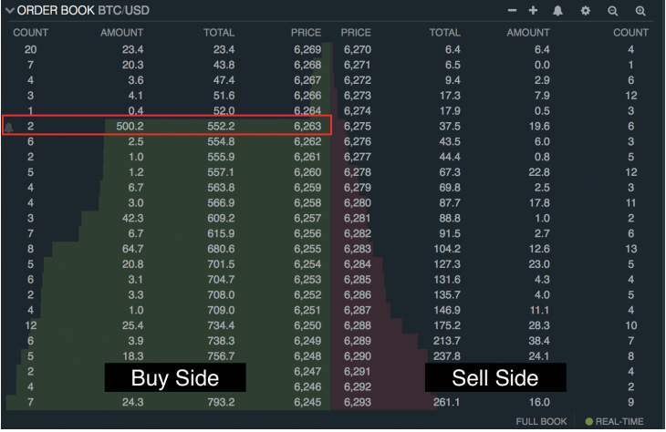 Так, на графике видим большой ордер на 500,2 единицы BTC, ожидающий исполнения по цене в 6263 доллара.
