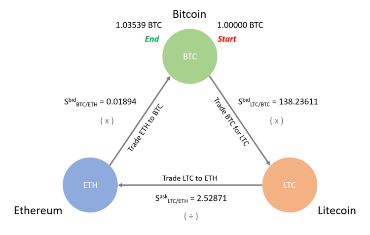 Иллюстрация сверху показывает как треугольный арбитраж может приносить прибыль. Алгоритм следующий: