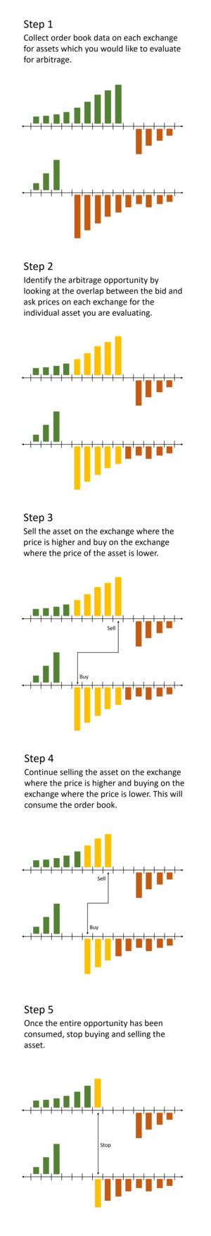 Давайте посмотрим на «Шаг 2» на иллюстрации. Мы видим, что цена предложения на одной бирже выше или равна цене продажи на другой бирже для выделенной области.