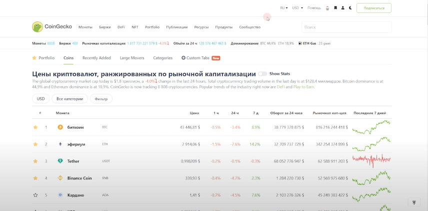 Ресурс с расширенным инструментарием аналитики позволяет сортировать активы по различным метрикам: аглоритму хэширования, платформе или категории. CoinGecko отображает курс в 38 фиатных валютах и рыночную капитализацию более 6317 активов с 435 бирж. Он позволяет отследить активность разработчиков монеты, фундаментальные события проектов и внутрисетевые показатели. На сайте можно сформировать виртуальное портфолио криптовалют, проанализировать статистику по монетам, стейблкоинам, токенам, DeFi, деривативам и биржам.